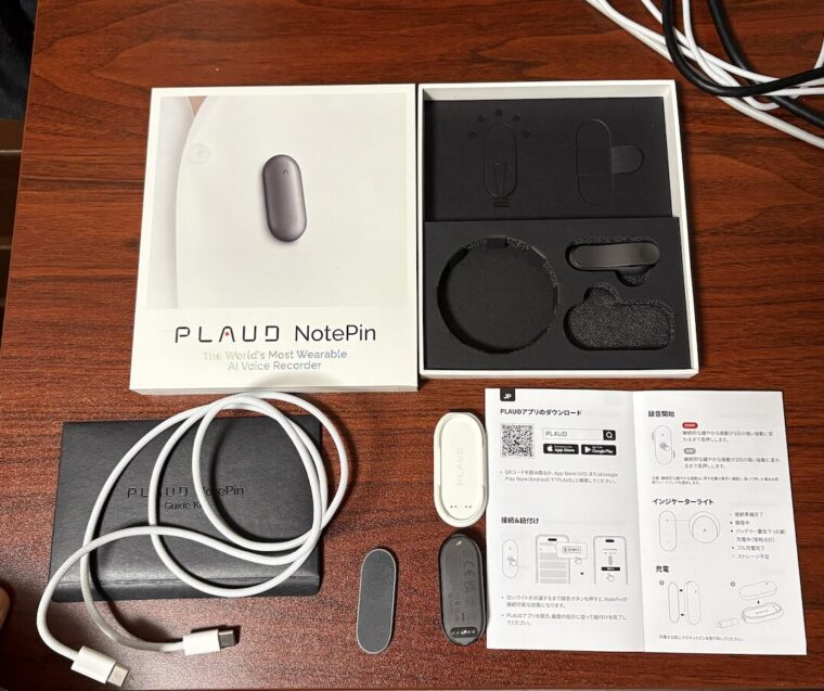 あとそれから使ってみて、いろいろ他にも試せないかな、なんか使えることあるかもしれないんで、これからどんどん試していきたいとは思ってますっていう感じですね。で、これなんですけど、すごくシンプルで、開けてみるとブロード本体と充電器と充電ケーブルが入っていて、あとはDINですね。デフォルトだと服に留めるピンがついてるんですけど、それをつけて会議とかに出ることで録音できるというような感じになっていて、驚いたのはすごく楽で、説明書見なくても充電くらいはすぐパッとできますし、あと充電して、あとはその説明書に書いてあるQRコードからアプリをアップ。