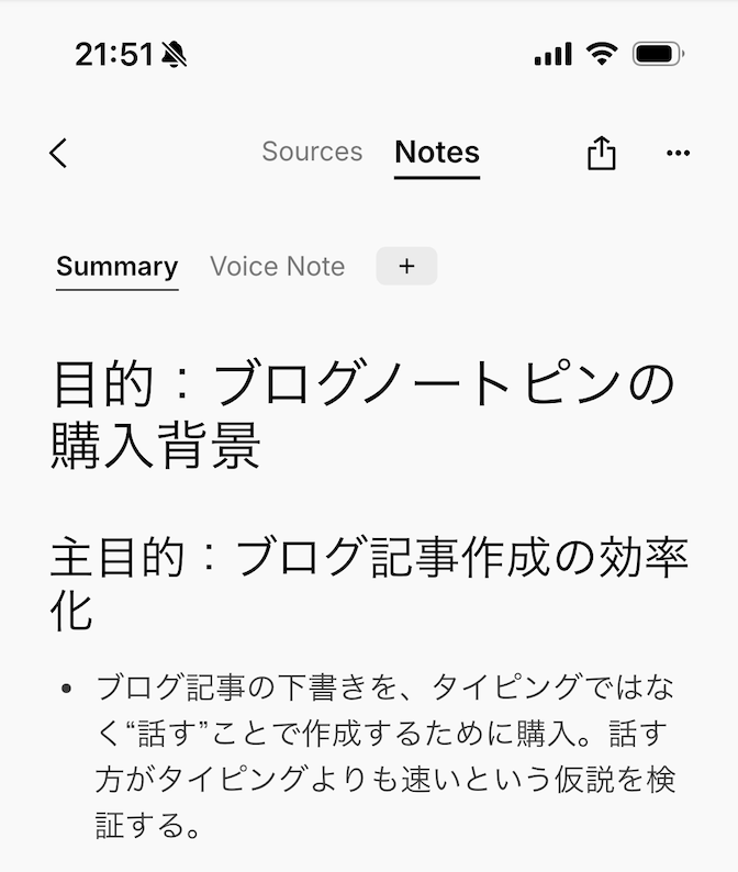 ブログを書いているので、しゃべる → AIが文字化 → 整えるのフローを試したくて購入。この記事も一部NotePinで作成しました(原文は末尾で公開)。