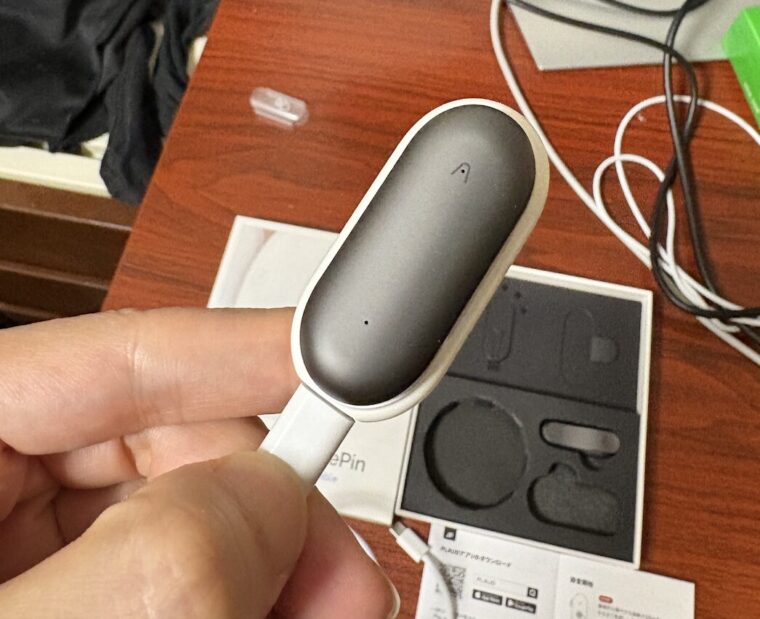 あとそれから使ってみて、いろいろ他にも試せないかな、なんか使えることあるかもしれないんで、これからどんどん試していきたいとは思ってますっていう感じですね。で、これなんですけど、すごくシンプルで、開けてみるとブロード本体と充電器と充電ケーブルが入っていて、あとはDINですね。デフォルトだと服に留めるピンがついてるんですけど、それをつけて会議とかに出ることで録音できるというような感じになっていて、驚いたのはすごく楽で、説明書見なくても充電くらいはすぐパッとできますし、あと充電して、あとはその説明書に書いてあるQRコードからアプリをアップ。